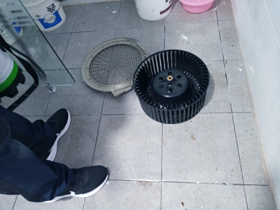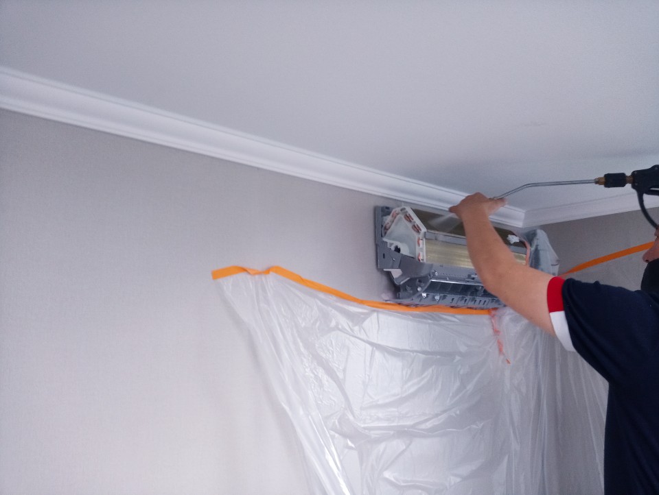 에어컨 전용세재 고압분수기를 구석구석 분사해 살균소독을 합니다.
