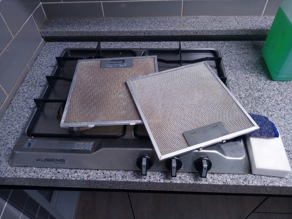 그리고 렌지후드 본판 위쪽으로도 먼지와 기름때로 인해 광택이 죽어있는 상태죠.