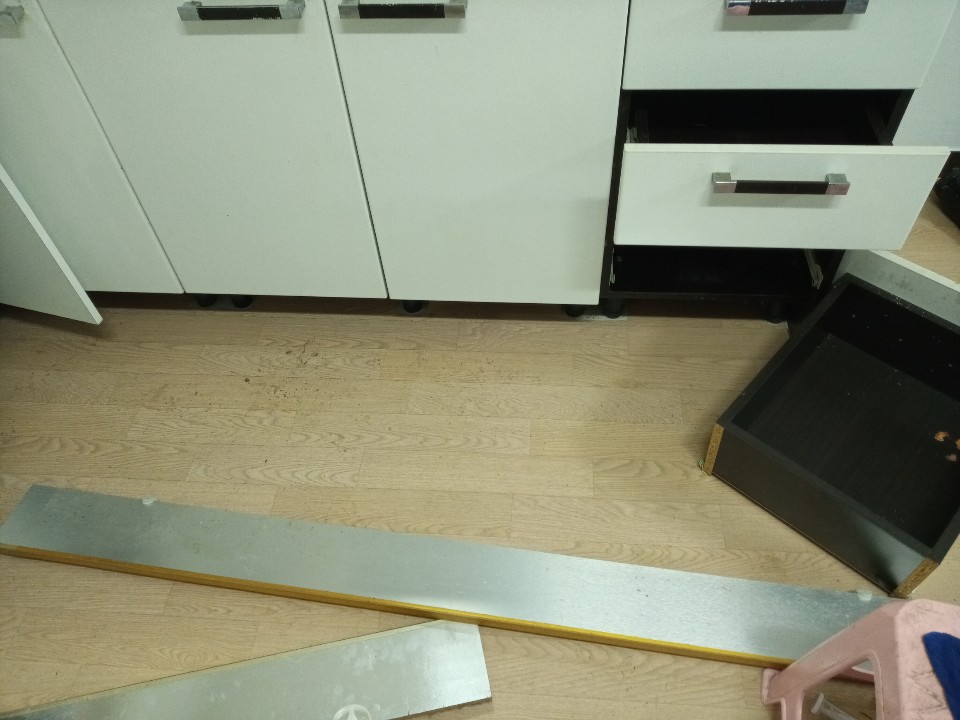 수납공간 싱크대 걸레받이 분리 후 그동안 쌓인 먼지와 묶은 때를 확인합니다.