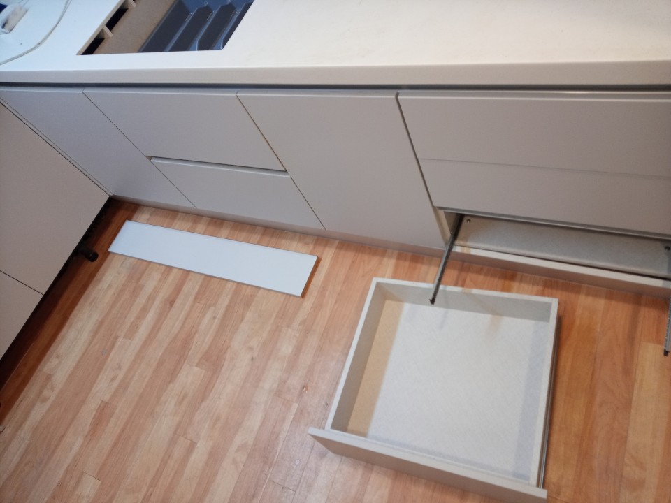 먼지가 수납장과 하부 걸레받이 속에 가득한 현장이었어요,