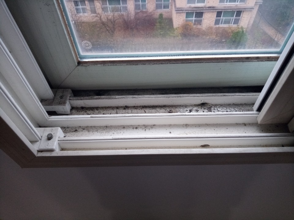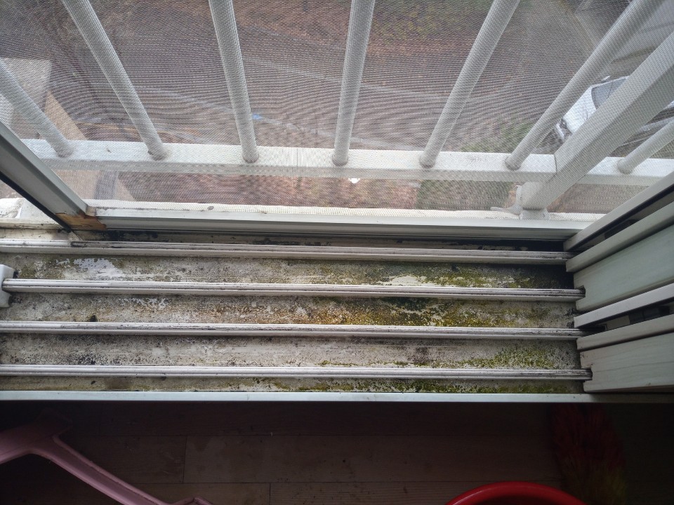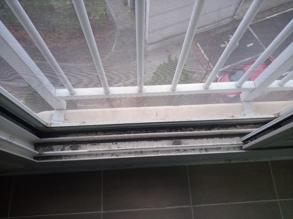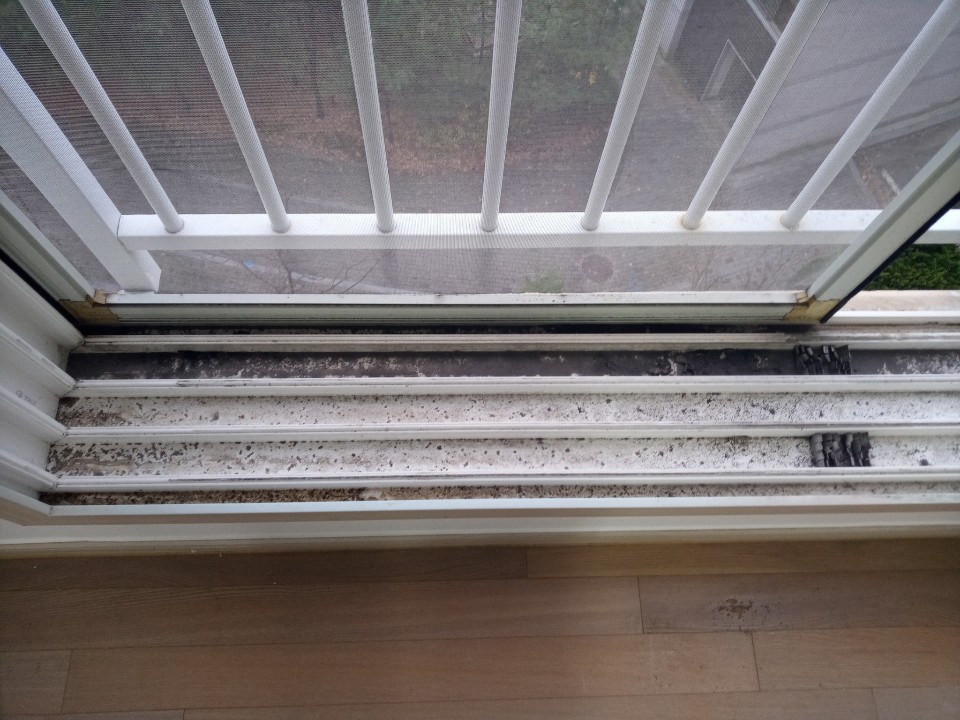 드물게 보는 창틀에 쌓인 오염물 퇴적층,