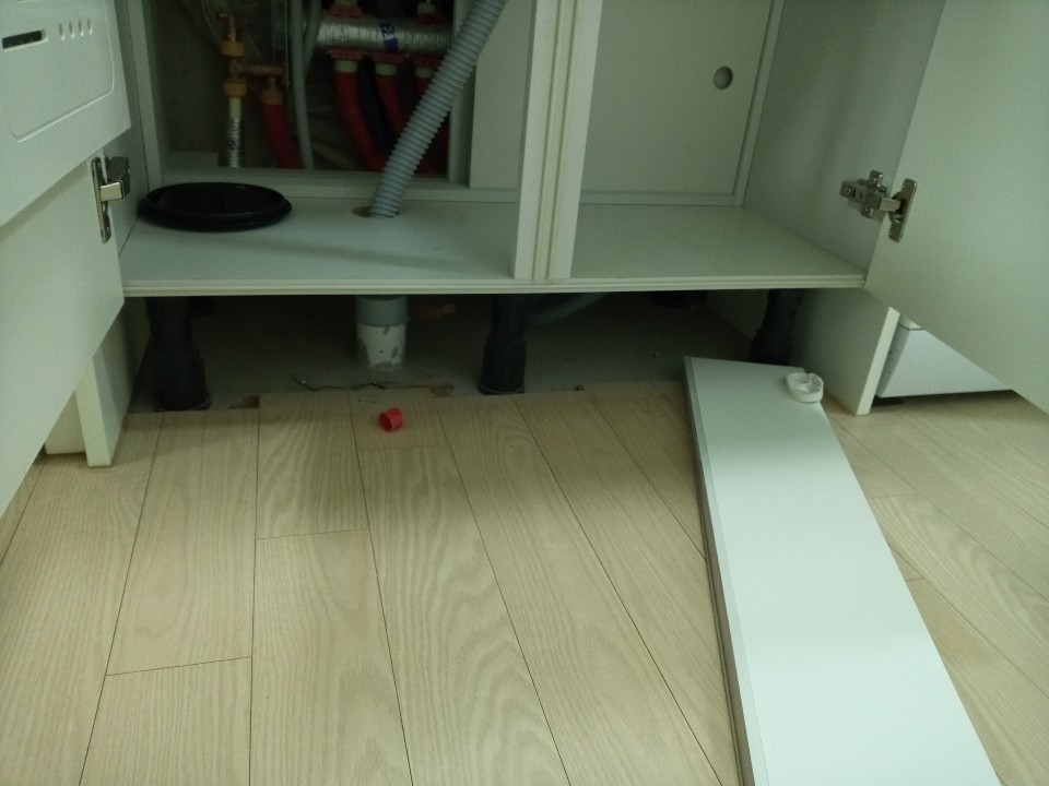 씽크대하부 걸레받이 탈거 후 쓰레기와 먼지제거