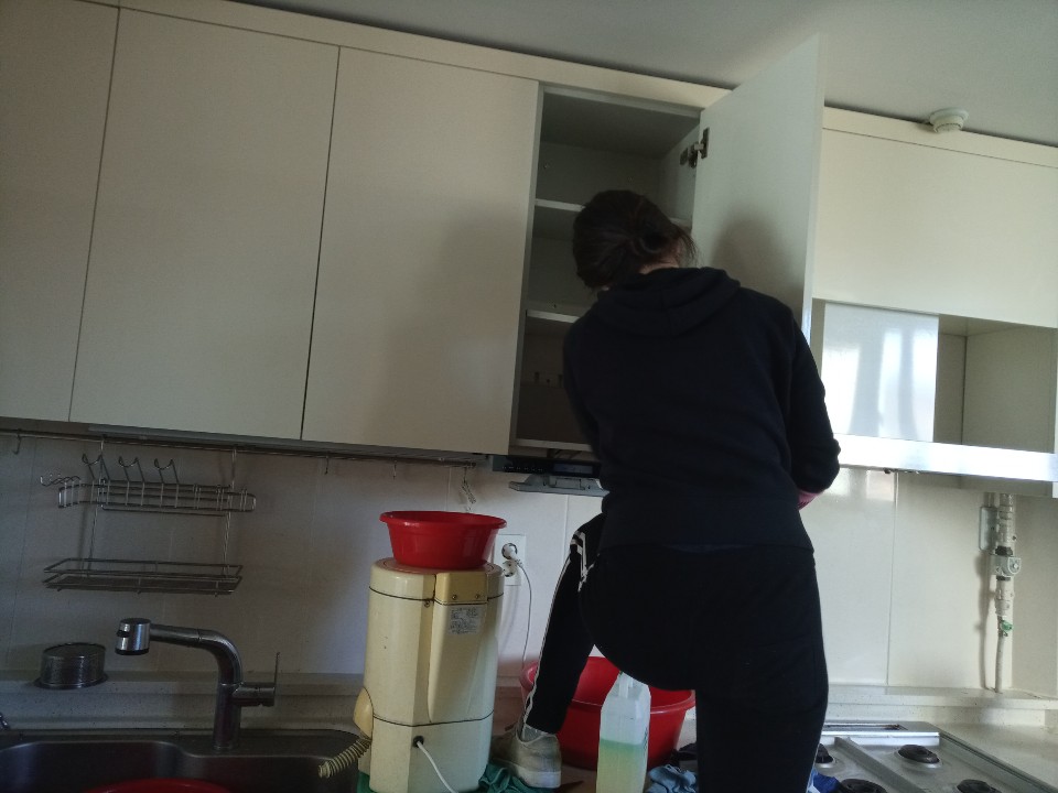 주방의 수납장도 탈거, 걸레받이도 뺀 후