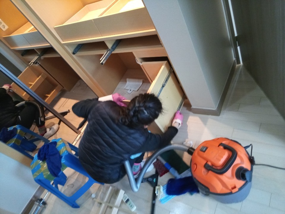 진공청소기로 흡진하고 구석구석 닦아내면서