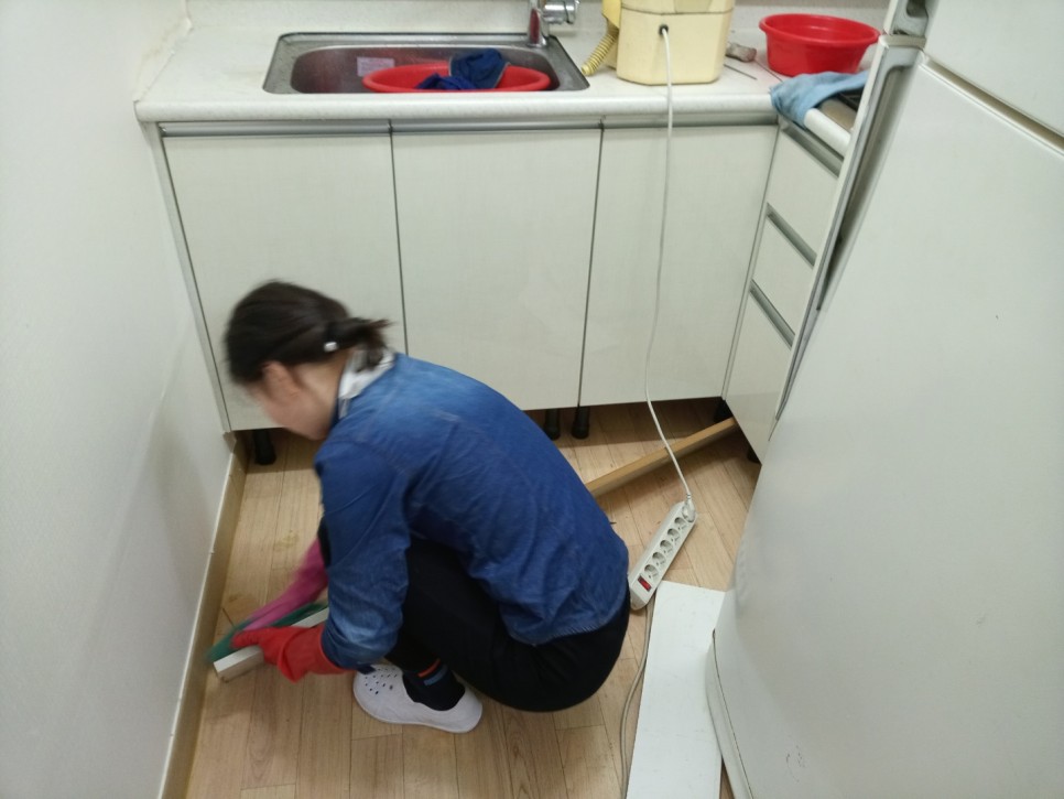 싱크대 걸레받이 분리 후 그동안 쌓인 먼지와