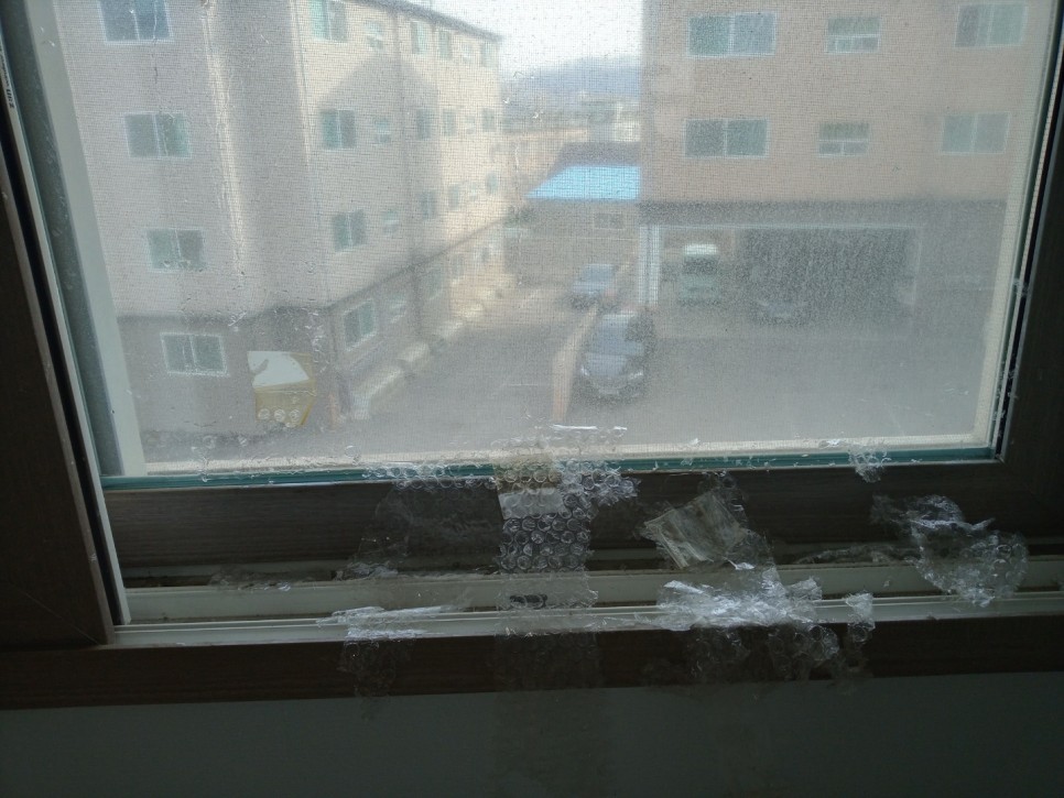 창문에 보온용 뽁뽁이제거작업을 하고