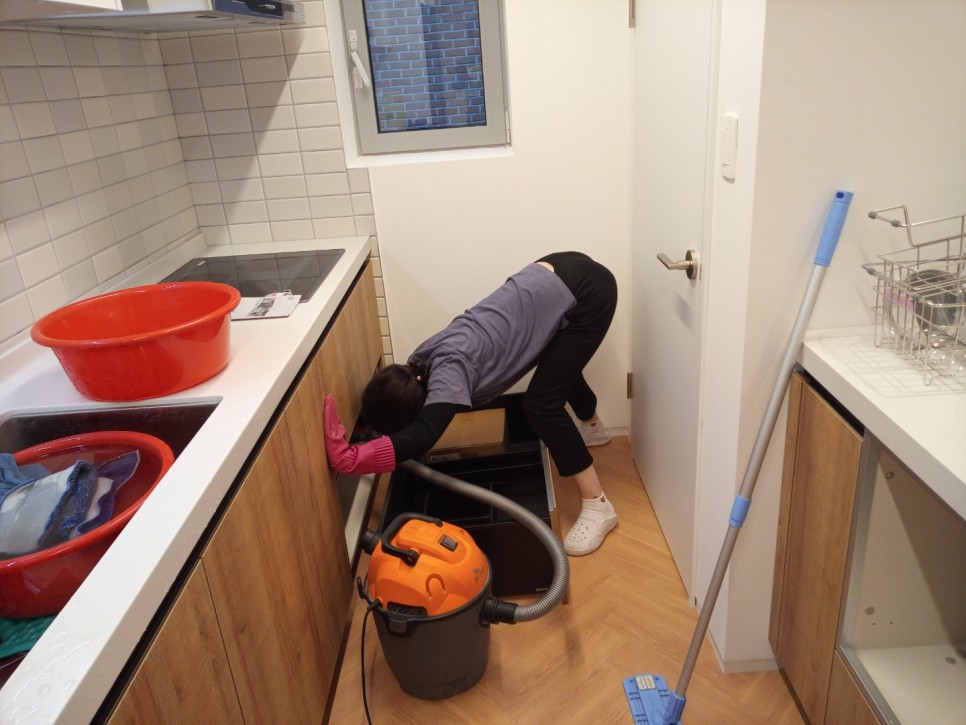 구석구석 꼼꼼하게 청소를 진행합니다.주방의 탈거가 가능한 수납장은 탈거하여