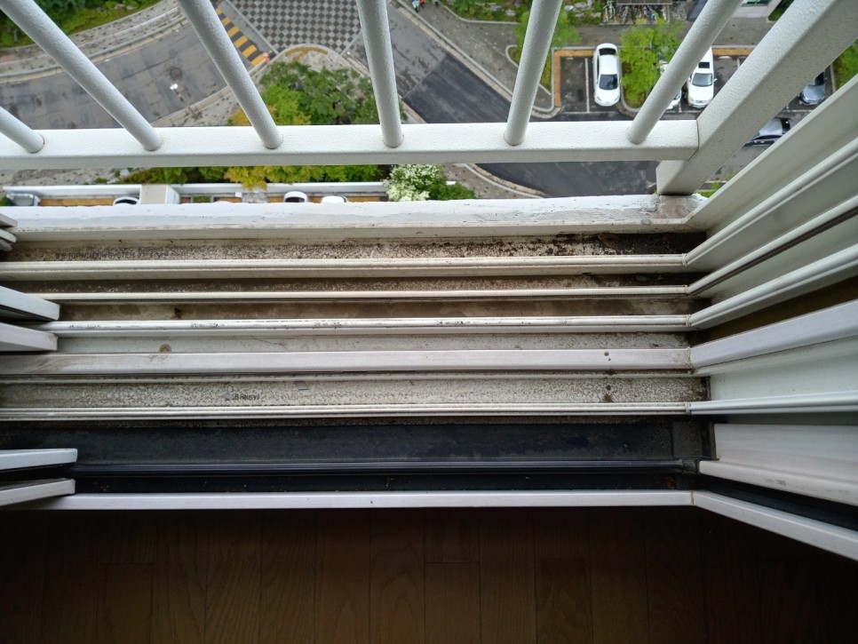 창문틀에 묵은때와 곰팡이 제거작업을하며
