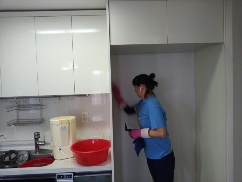 유리창 내부를 깔끔하게청소합니다.주방엔 음식을 하며 생긴 기름때가