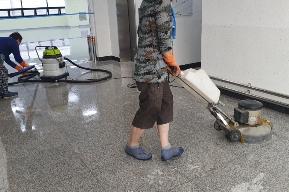 전용세제를 이용해 구석구석 닦아냈어요.사무실입구,엘레베이터입구 대리석바닥은