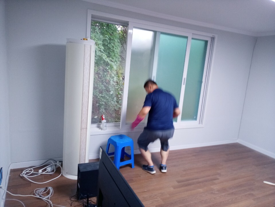 탈거해서 닦고 부착합니다.내부 유리창의 얼룩제거, 샤시와 창틀 오염 및