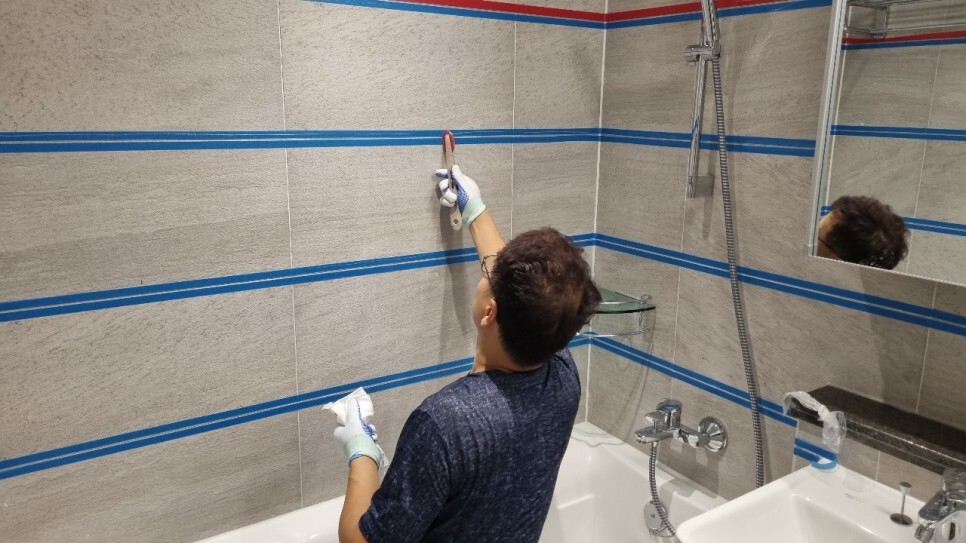 타일 한줄 한줄 마스킹테이프 작업을 합니다.