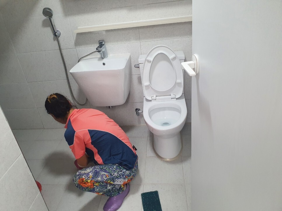 좁은 공간에도 빠짐없이 청소도구를 이용해 청소하고