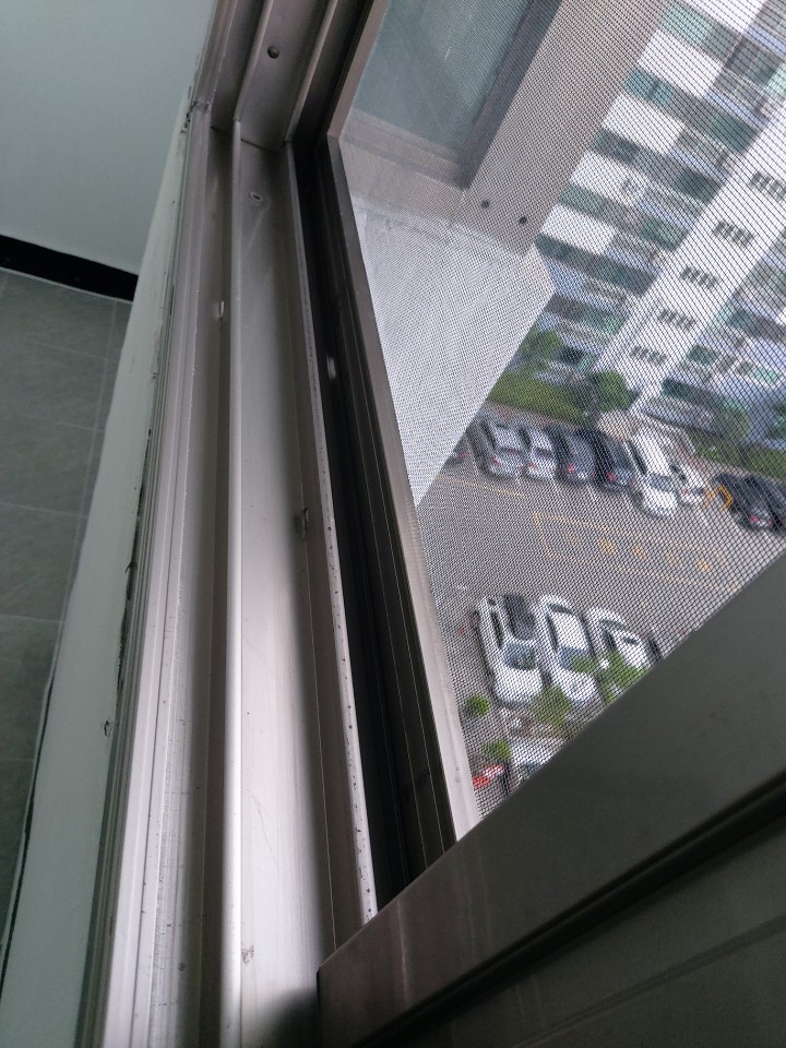 베란다 창틀 샷시 유리창을 청소하고,