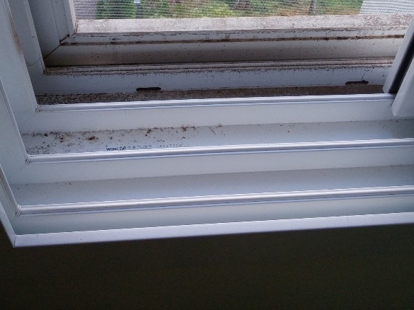 창틀에 들러붙어 딱딱하게 굳은 이물질은