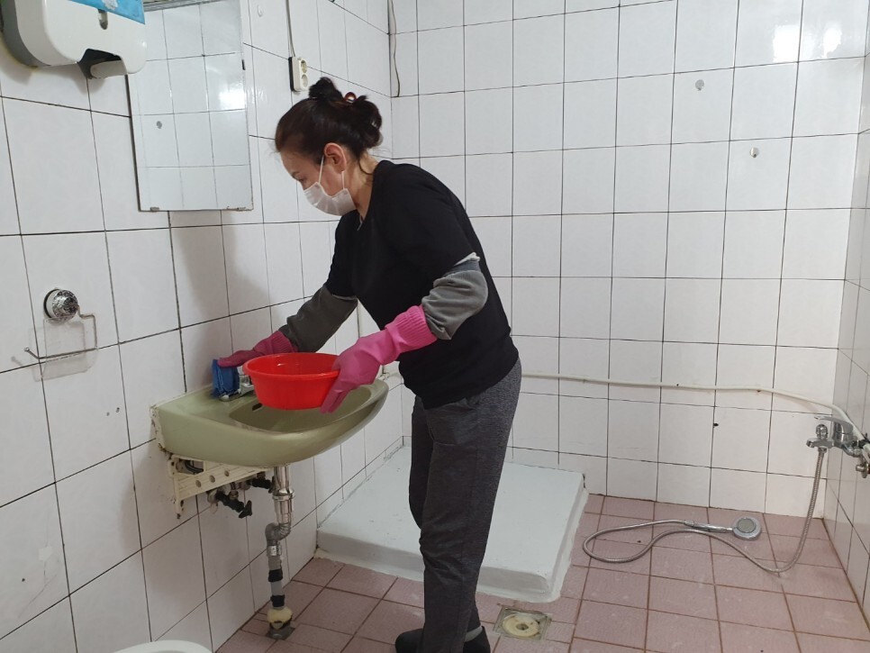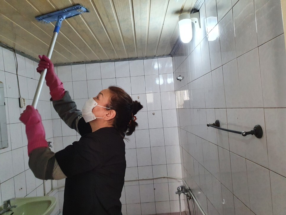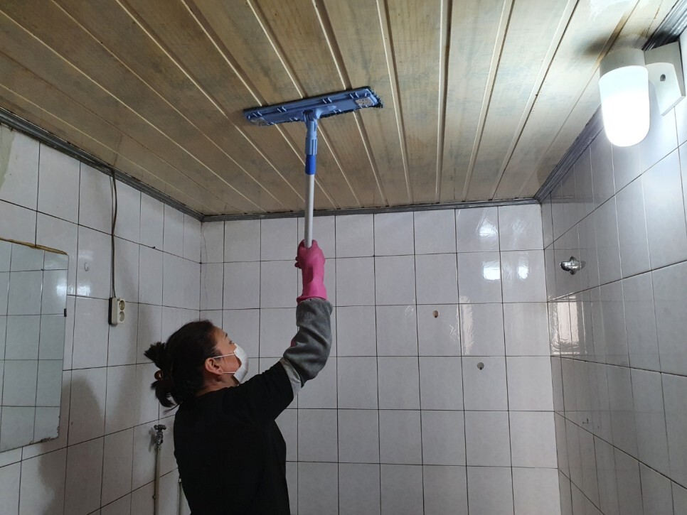 곳곳에 묵은때로 약품을 뿌리고 닦아내는