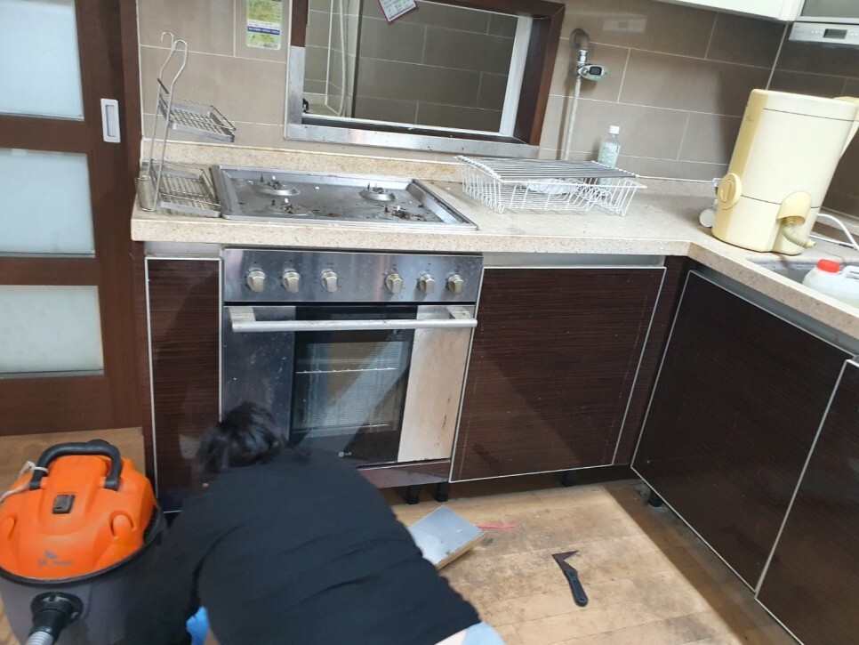씽크대 하부장 걸레받이 탈거 후 톱밥과 먼지,