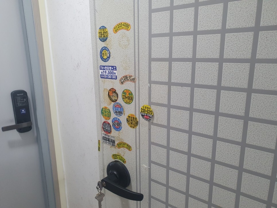 현관문에 오래된 이물질과 스티커를 전용약품을