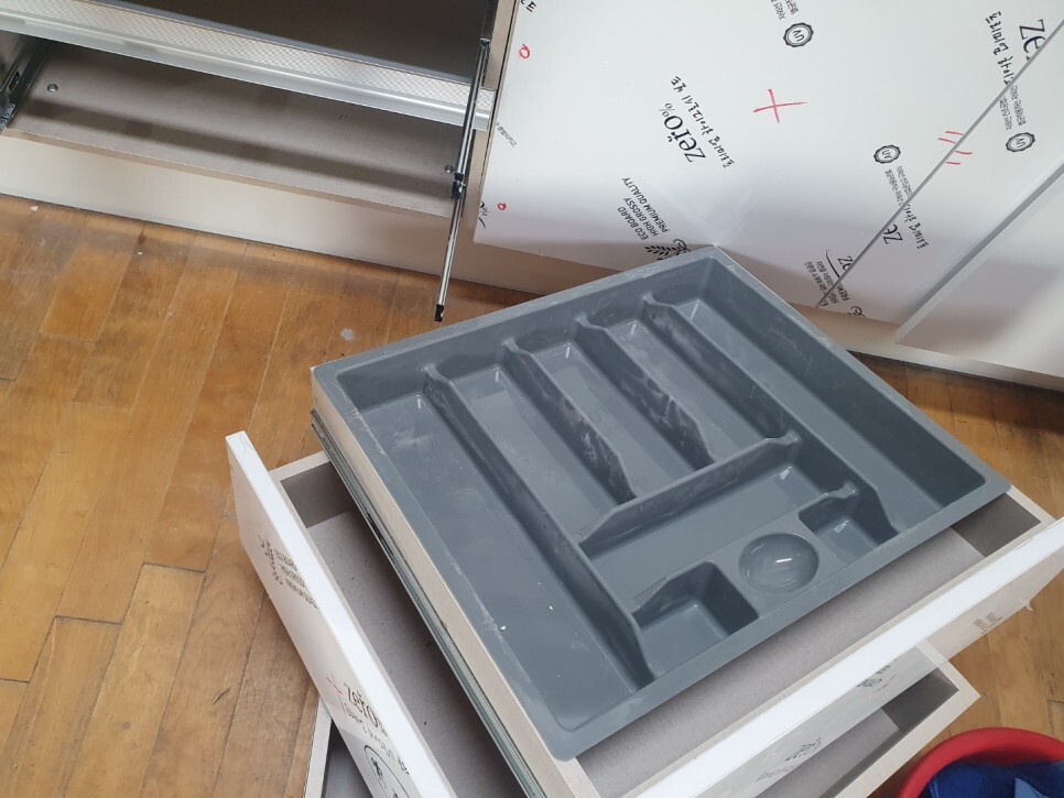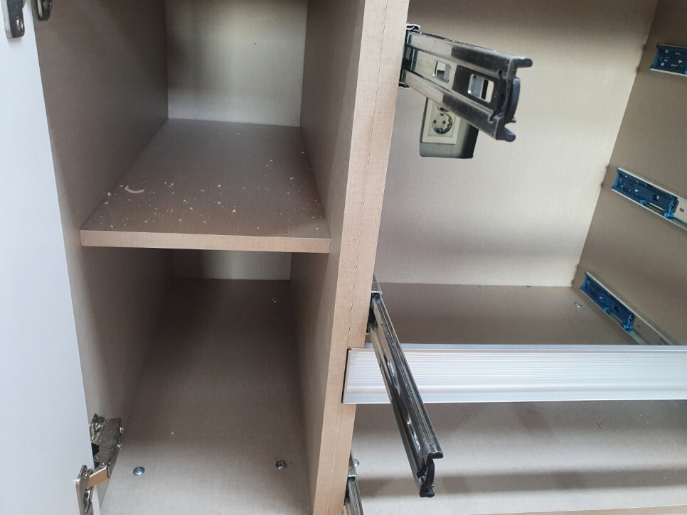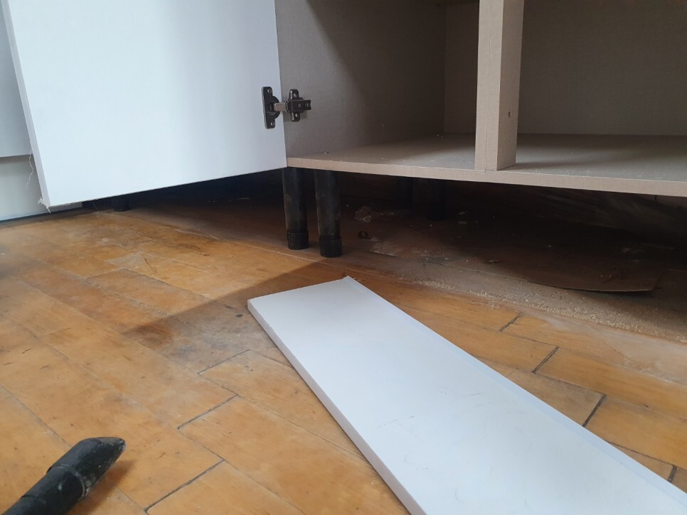 씽크대 하부장 걸레받이 탈거 후 바닥의 뽀얀 먼지와