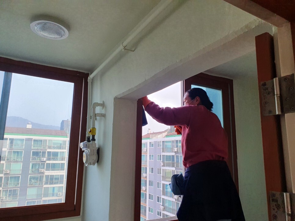 문틀에도 시공분진이 많아 구석구석 닦아냅니다.