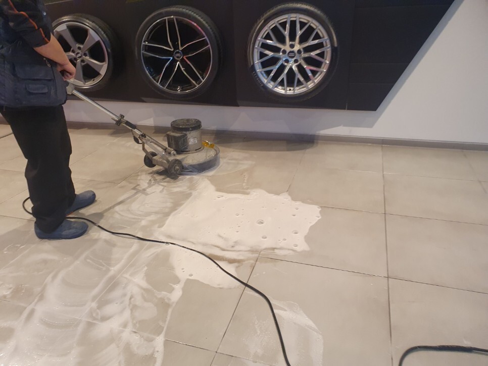 특히 흰색 바닥 타일은 3번 기계 청소 했어요.
