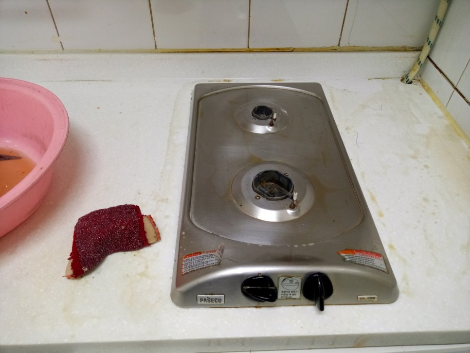 가스렌지에 화석처럼 붙어있는 기름덩어리를 조심스럽게 제거하고,