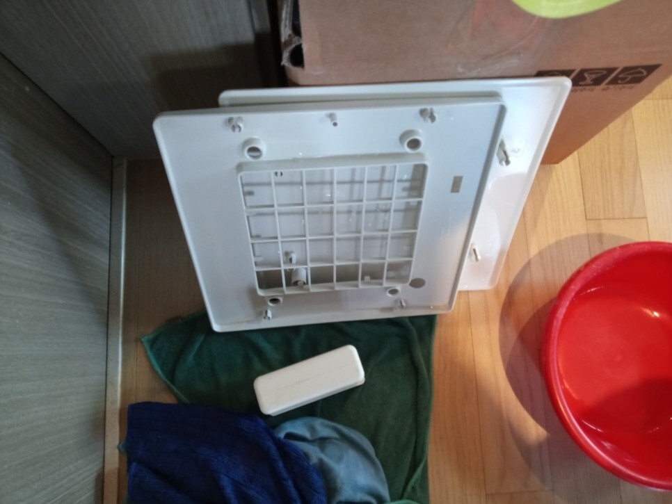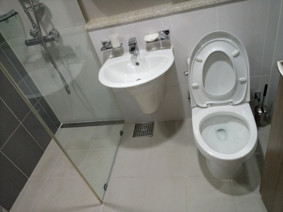 세면대, 수전, 전면 거울은 물때와 얼룩이