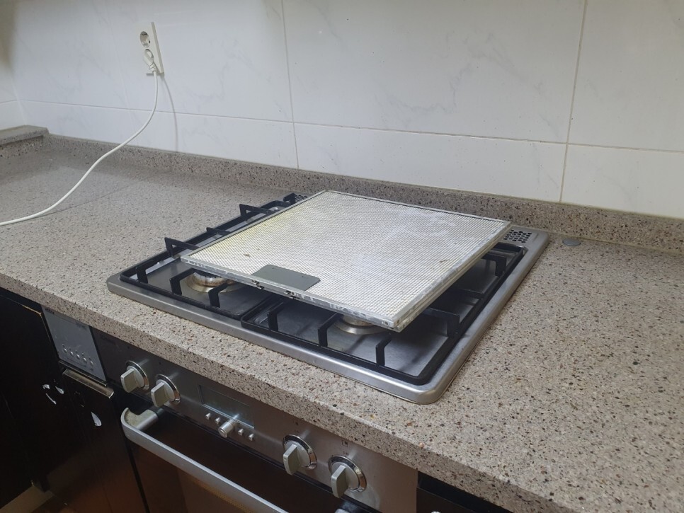 기름이 범벅이 된 주방후드와 렌지받침대는