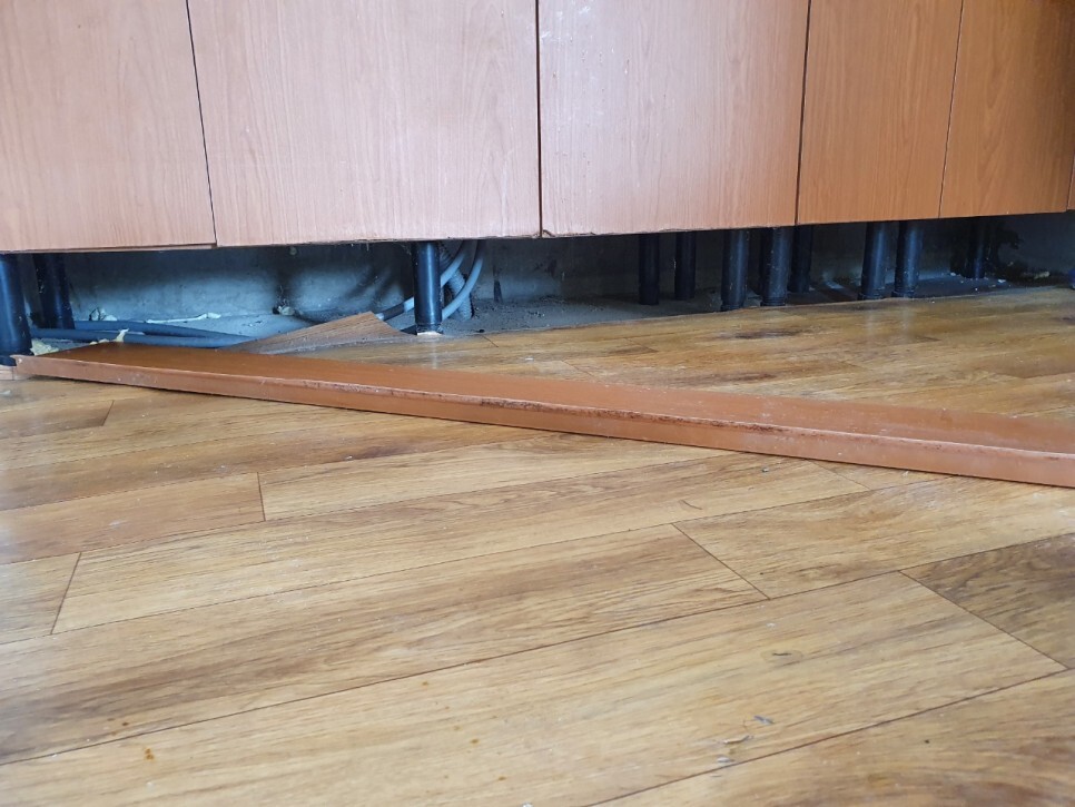 주방의 수납장도 탈거, 걸레받이도