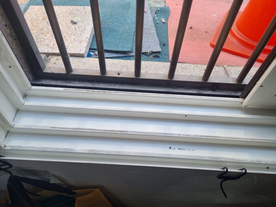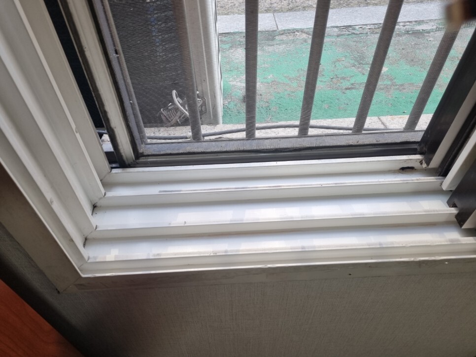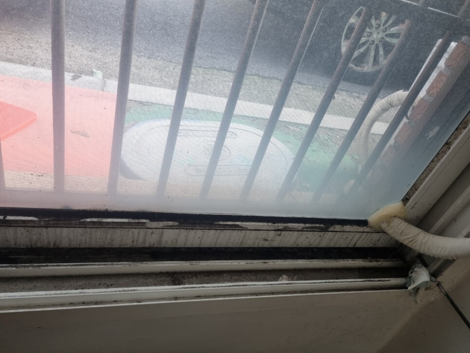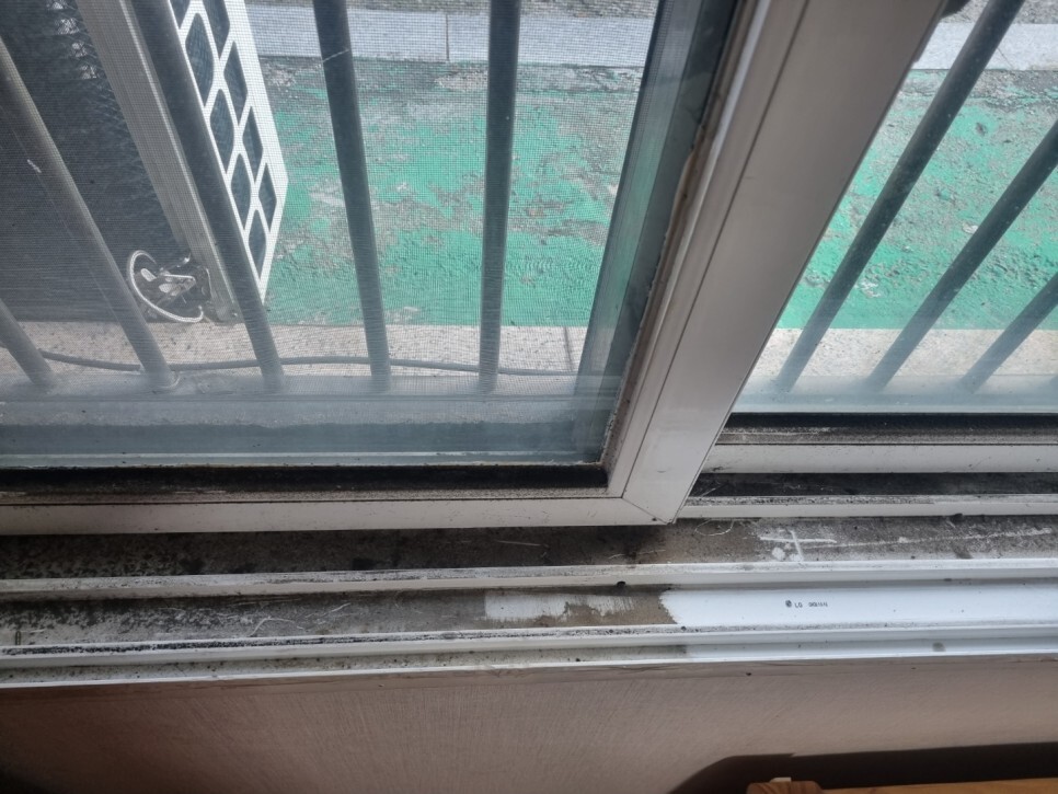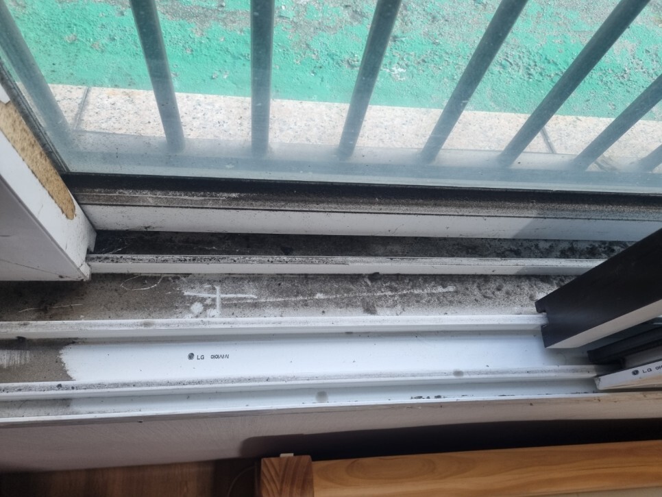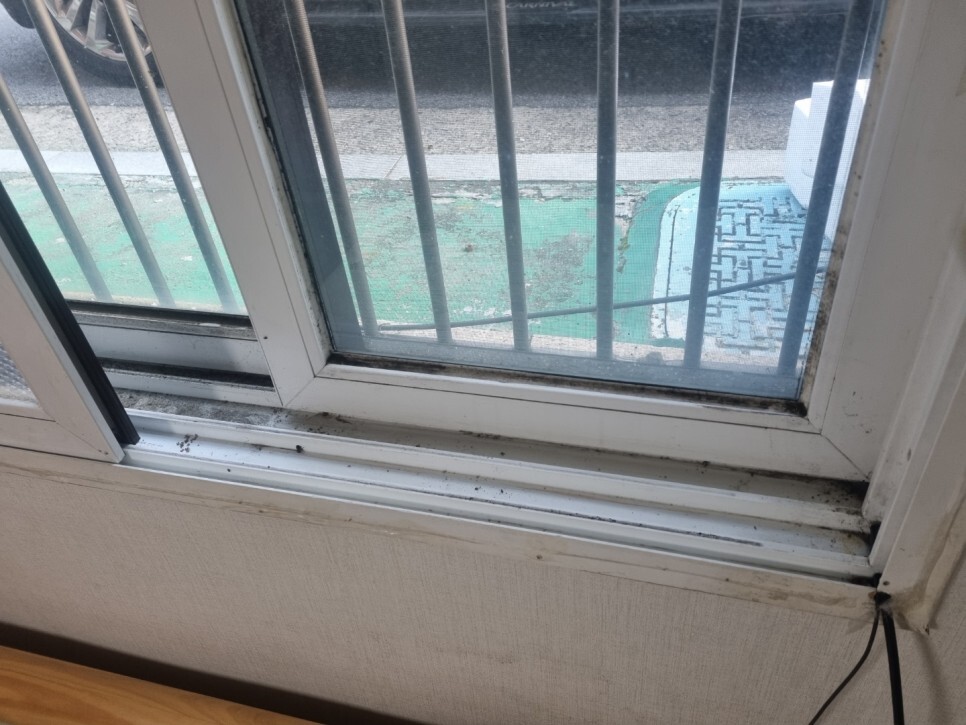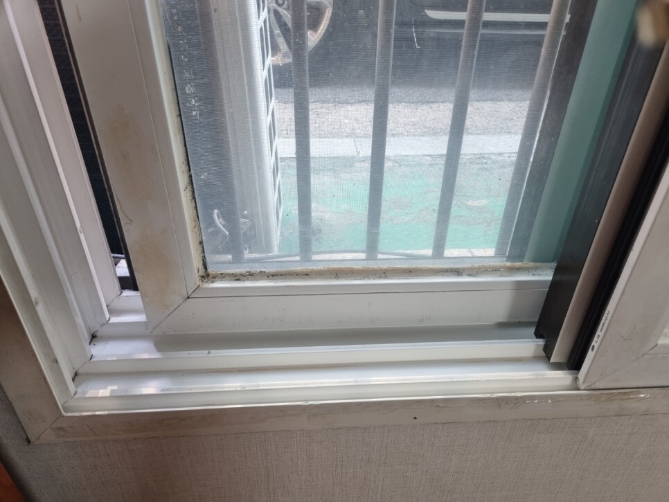 창문틀의 곰팡이와 각종 이물질.