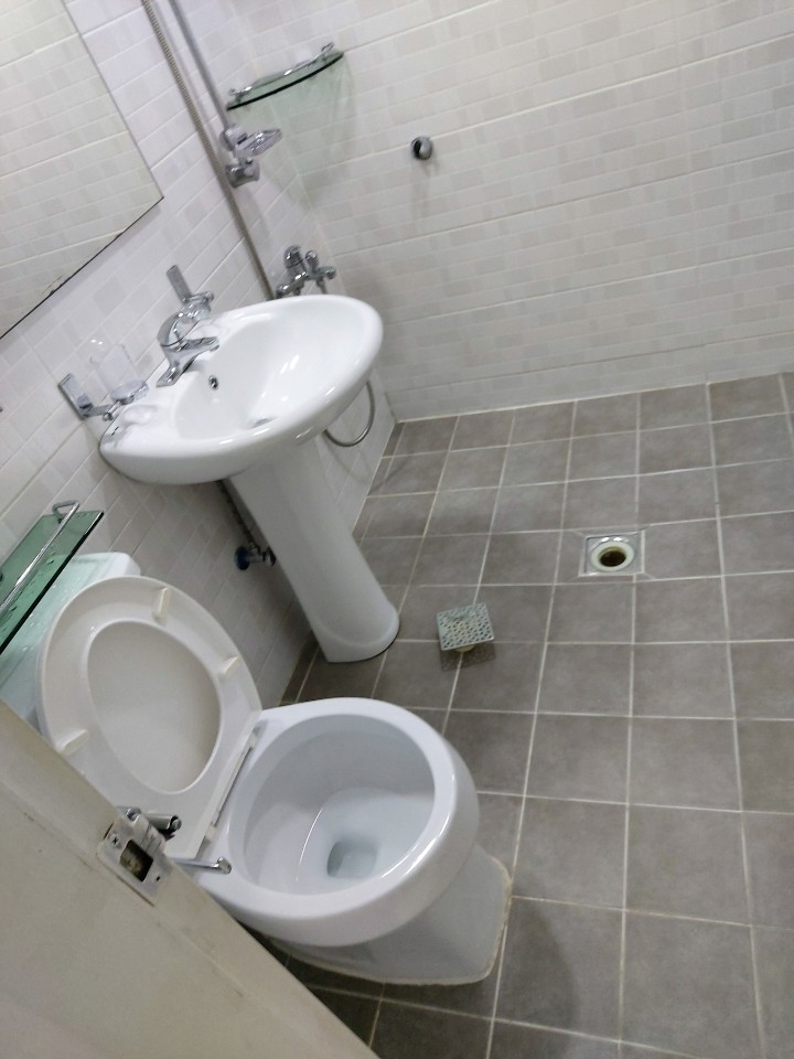 1차 청소가 끝난 후 고온스팀살균기를 사용하여 화장실의 배수구 수전 변기 등 전체적으로 살균처리를 하였습니다.