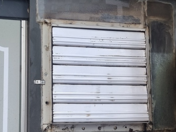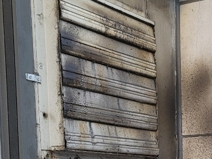 기름때로 얼룩진 고정된 외부주방환풍기,