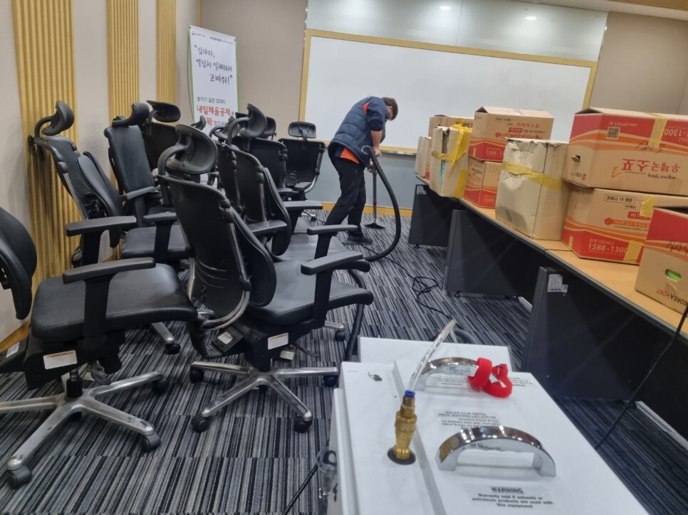 사무실 카펫 바닥을 깨끗하게 청소합니다.