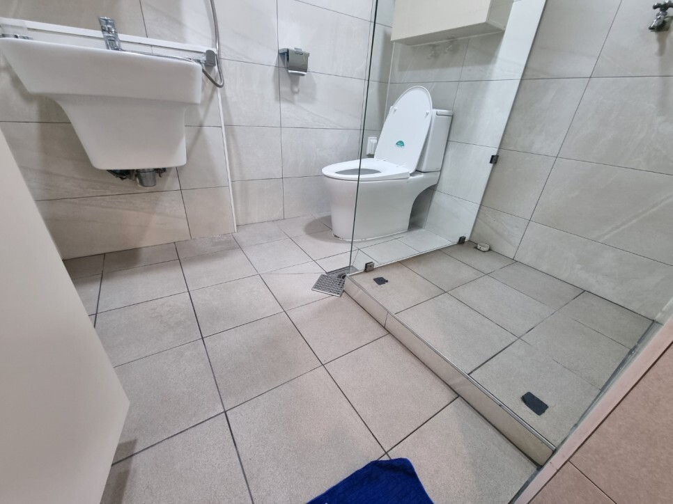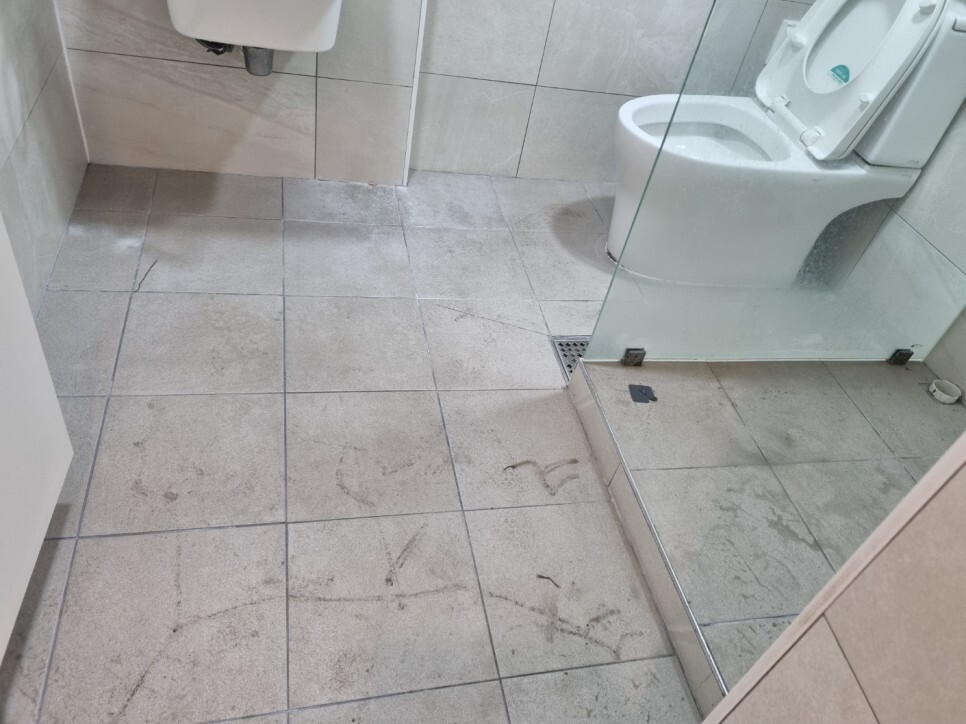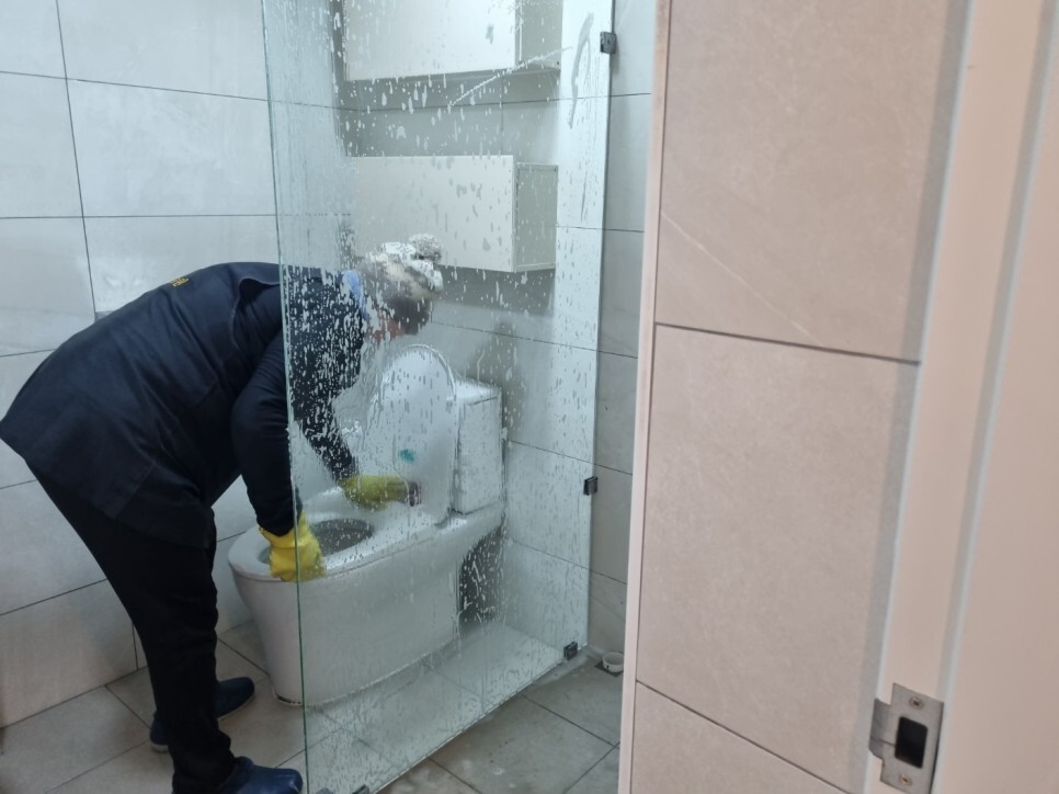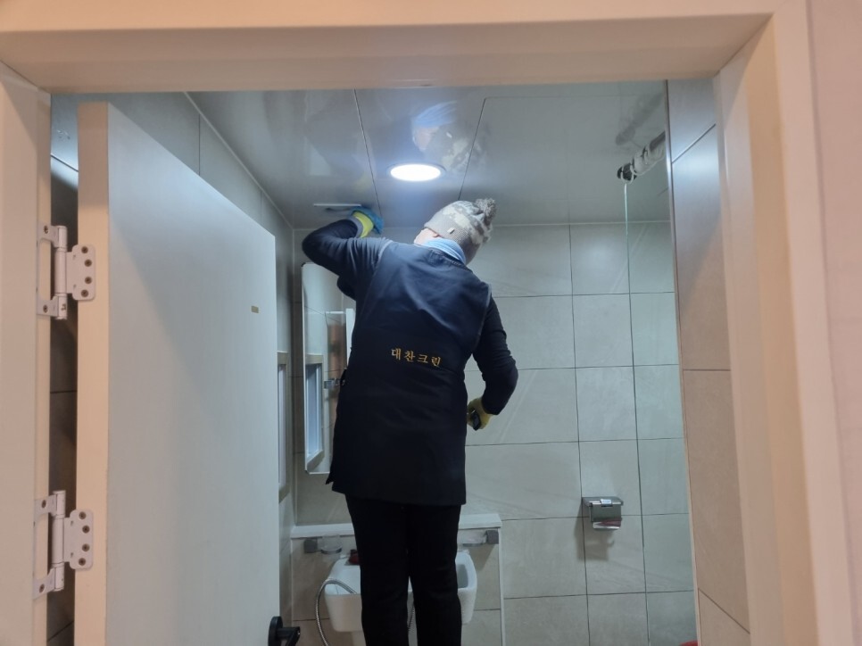 작업으로 욕실의 얼룩을 말끔히 닦아내고,