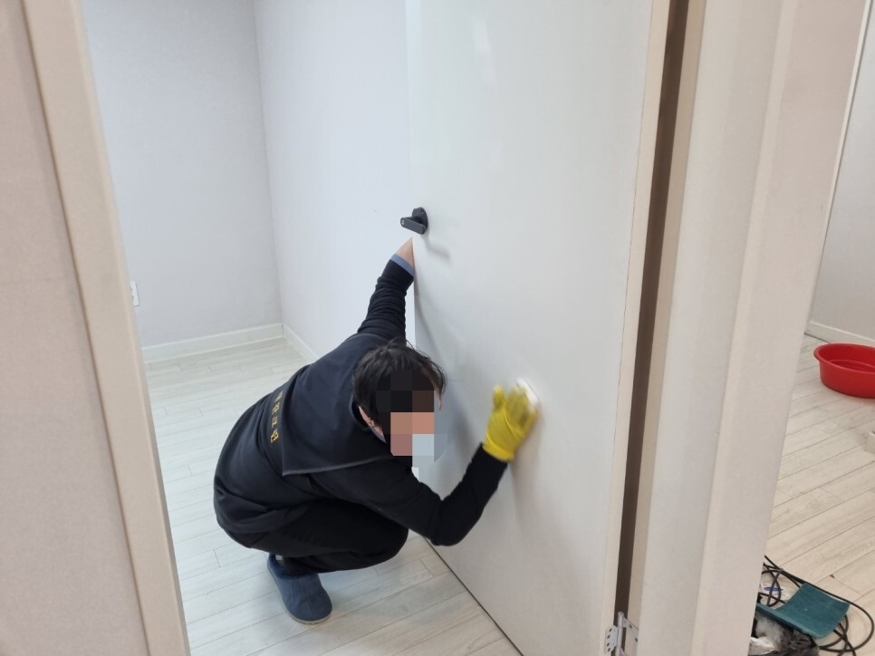 방문에도 아이들의 낙서가 있어 닦아냅니다.
