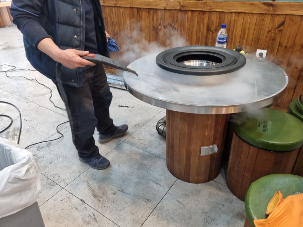 고압스팀기로 의.탁자를 살균소독을 하는