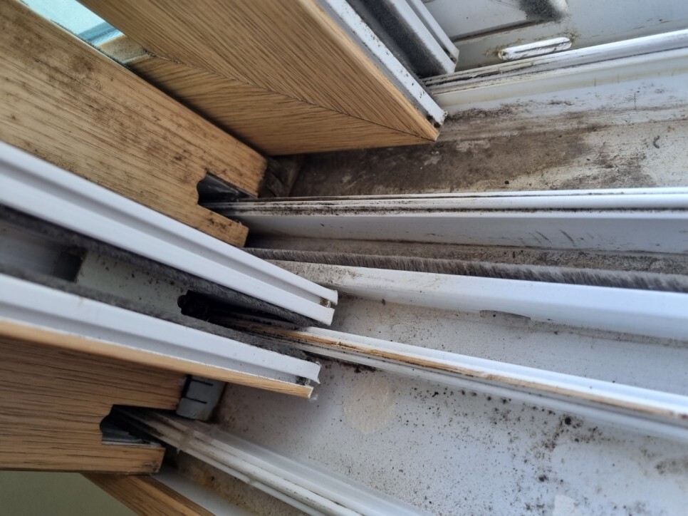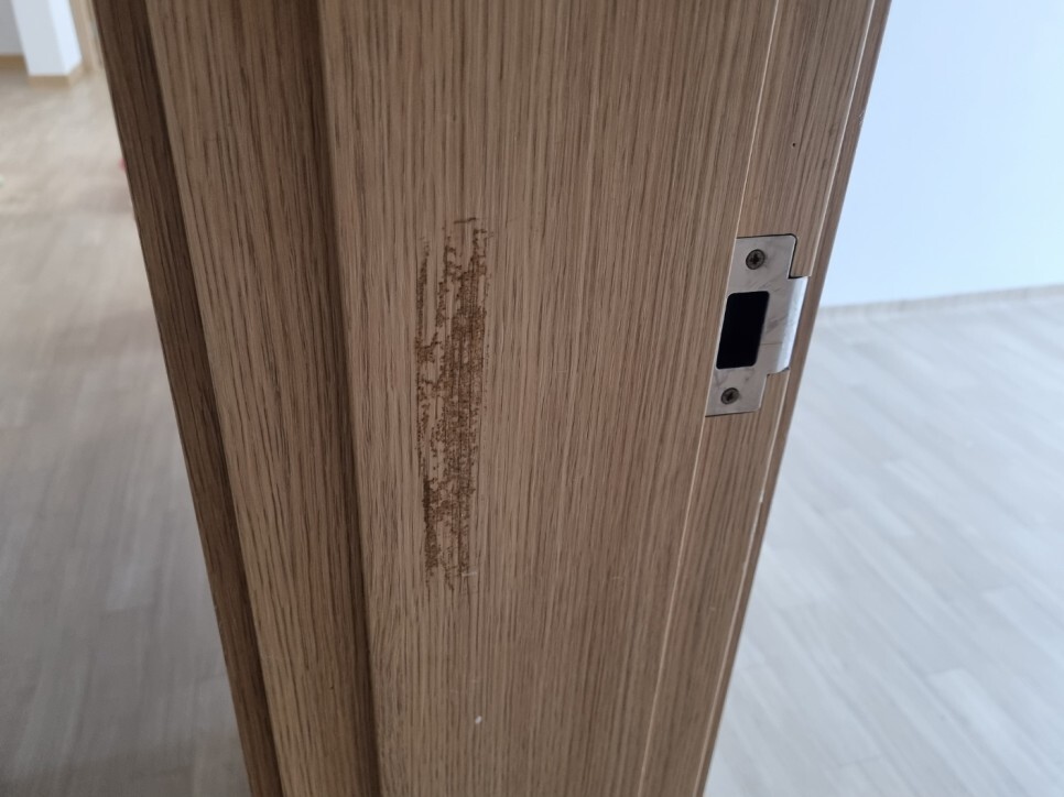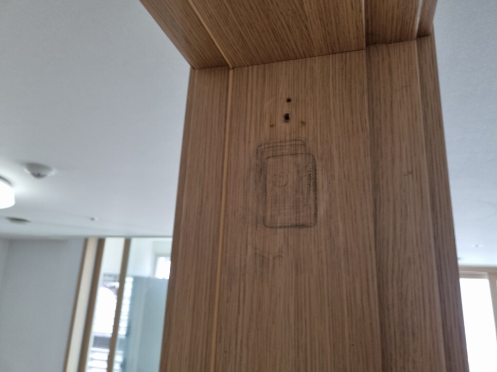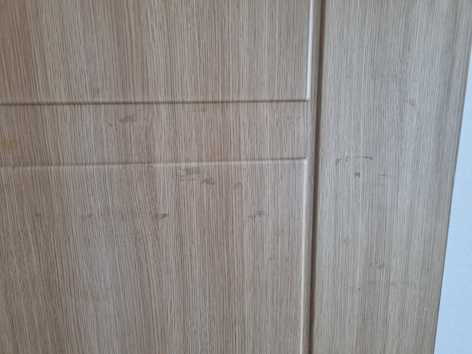 문틀과 방문에 낙서와 본드 오염물이